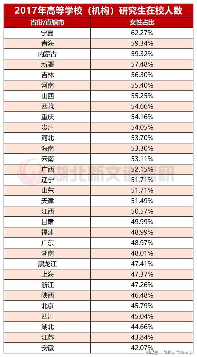 在校女研究生人數占比里,寧夏、青海和內蒙古占據前三,全都是邊遠省份和自治區,而相對發達的省份,安徽、江蘇和湖北則是占據榜單倒數三名。
