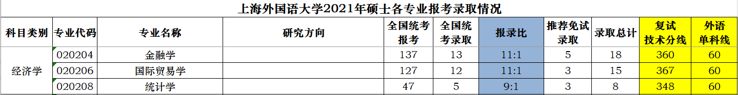 在經濟學學科類別中,金融學學術型碩士與國際貿易學專業報錄比均為最高,高達11:1,競爭激烈,這倆門專業也屬于該學科之中的熱門專業,報考人數非常多,建議謹慎報考。相對來說,復試分數線最低的是統計學專業,為348分,最高的是國際貿易學學碩,為367分。同時,外語單科線為60分。
