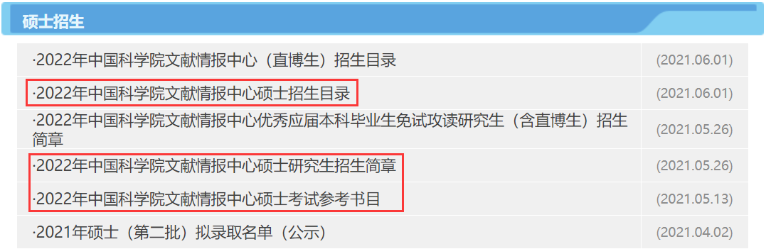 中國科學院文獻情報中心5月26日在官網發布了《2022年碩士研究生招生簡章》,于6月1日發布了《2022年碩士招生目錄》,對初復試要求、學費考試費用等內容作了具體說明。