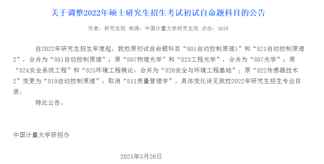 部分考試科目發生了變動。原初試自命題科目“801自動控制原理1”和“821自動控制原理2”,合并為“801自動控制原理”;原“807物理光學”和“823工程光學”,合并為“807光學”;原“824安全系統工程”和“825環境工程概論”,合并為“820安全與環境工程基礎”;原“822傳感器技術2”變更為“819自動控制原理”;取消“811質量管理學”,目前仍在更新中,有報考該院校的同學可以常刷新,看是否更新到自己的目標專業。