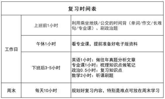 在職考研人最難的就是白天要工作,只有下班后和周末有空,所以只能拉長考研復習時間,如果你毫無基礎,那么可以提前一年進行備考,做出一整年的復習計劃,再根據每個階段的進度進行調整。